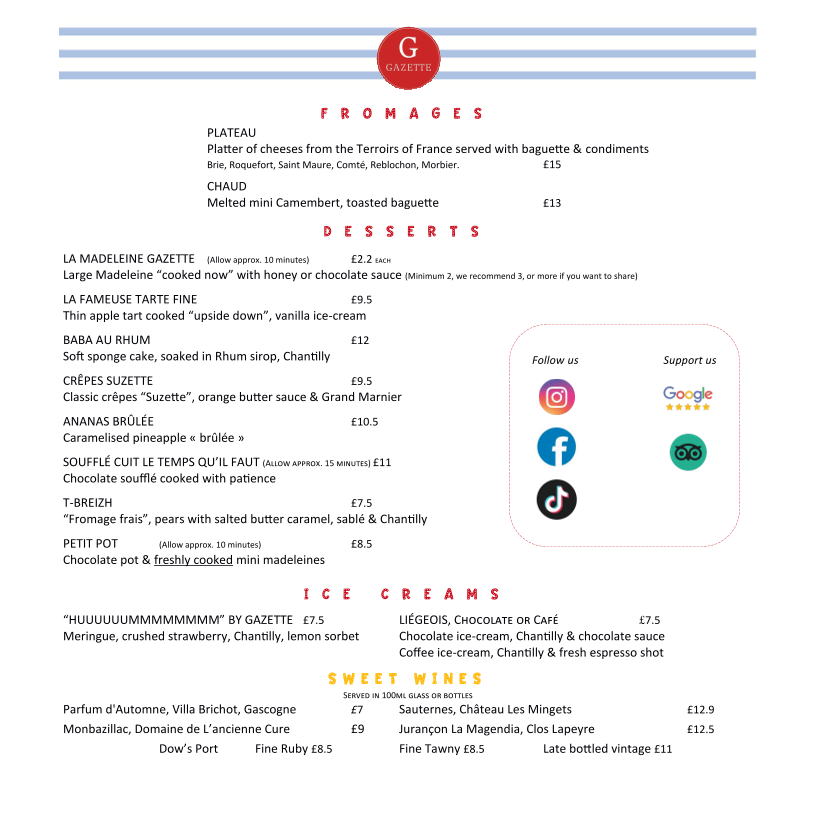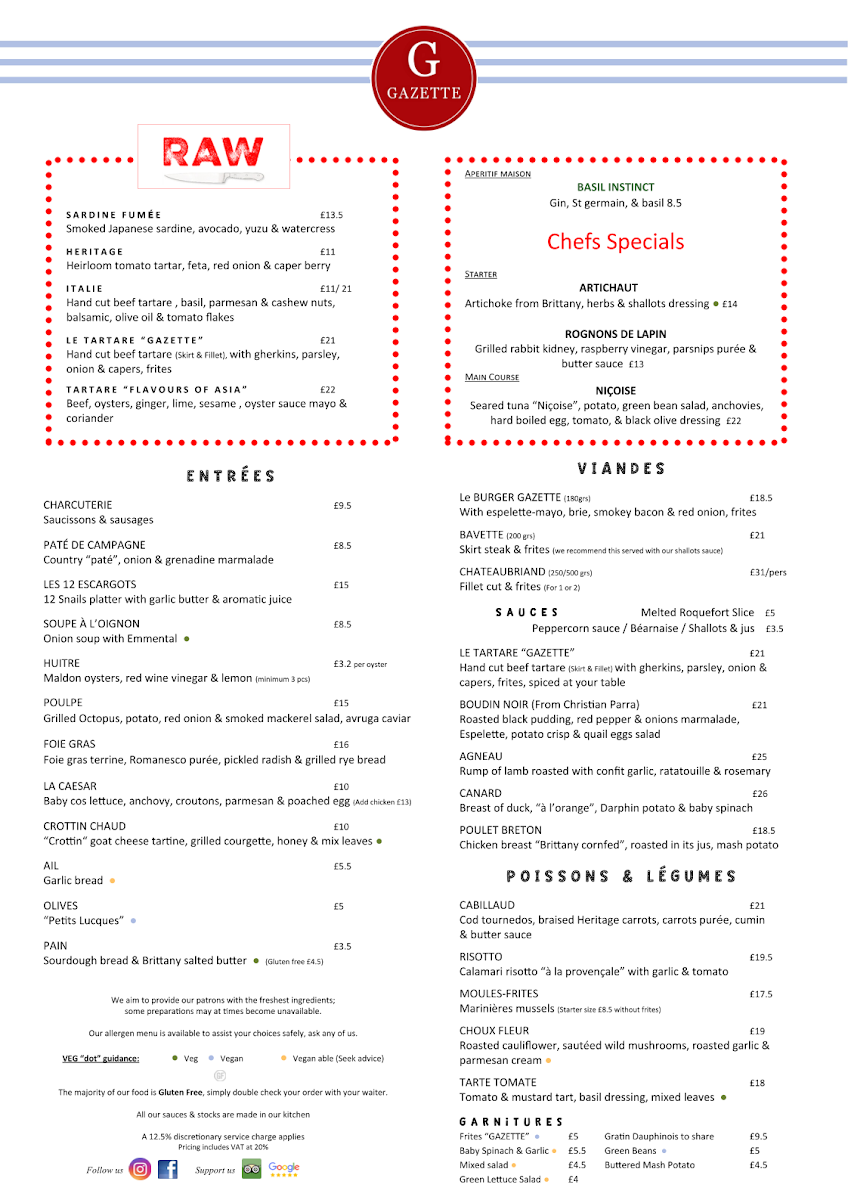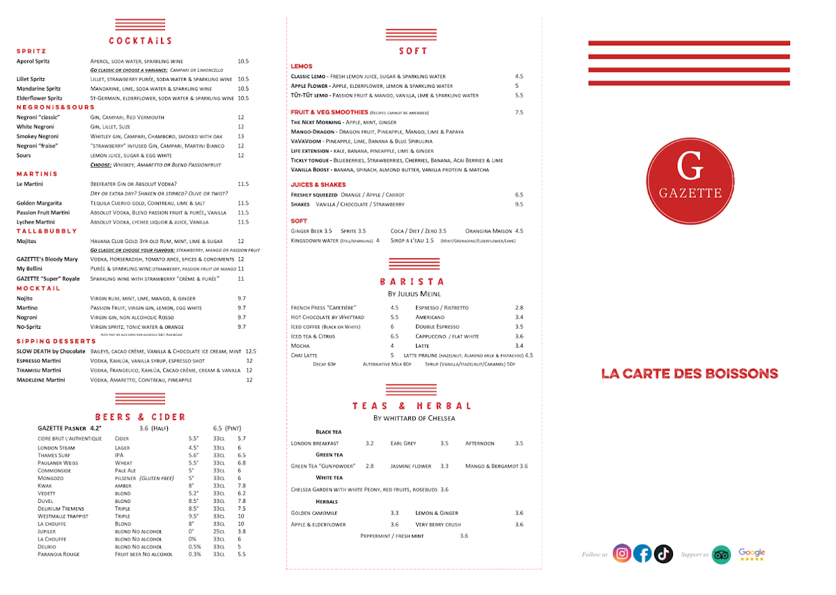 The Gazette Trinity Menu features a variety of options that cater to both meat lovers and vegetarians alike. The menu's offerings range from fresh salads and hearty mains to indulgent desserts. The standout item on the menu is the Gazette Burger, made with high-quality beef, crispy bacon, and melted cheese-perfect for anyone craving a classic pub meal. For those looking for a lighter option, the Mediterranean Salad is a refreshing choice, packed with vibrant vegetables, olives, and feta cheese.
