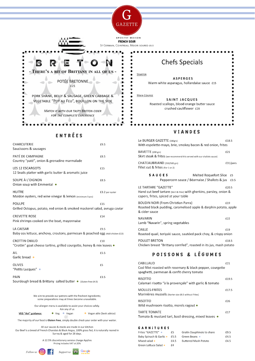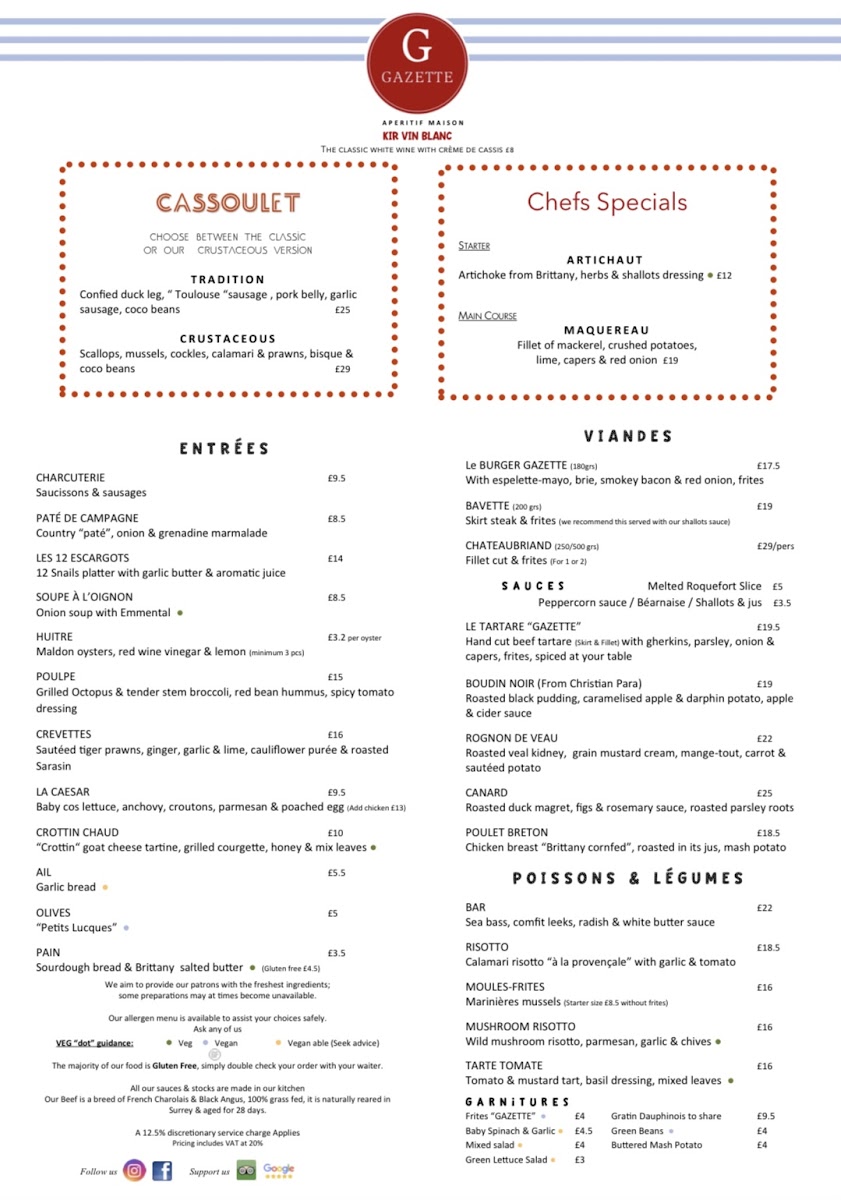 1 Kilo of Mussels served with GAZETTE hand cut / cooked twice frites. Choose your flavour right: MARINIERES, POULETTE ( cream ), ROQUEFORT or CHORIZO.